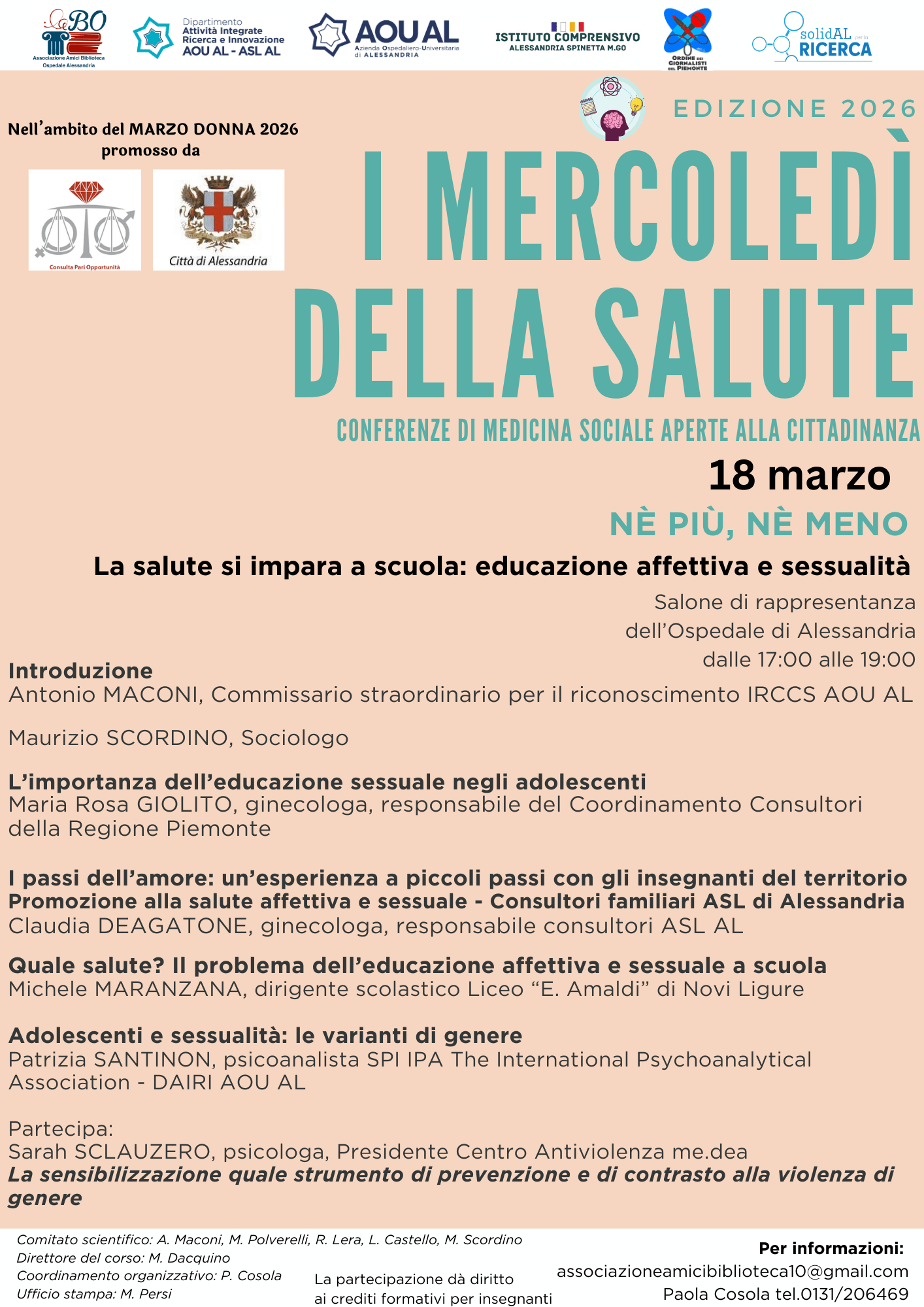 L’iniziativa si inserisce nel programma di eventi di “Marzo Donna 2026” – rassegna promossa dalla Consulta per le Pari Opportunità e dal Comune di Alessandria – e rappresenta un’importante occasione di dialogo tra mondo sanitario, scuola e comunità, con l’obiettivo di promuovere una cultura della salute e delle relazioni fondata sull’informazione, sulla consapevolezza e sul rispetto.